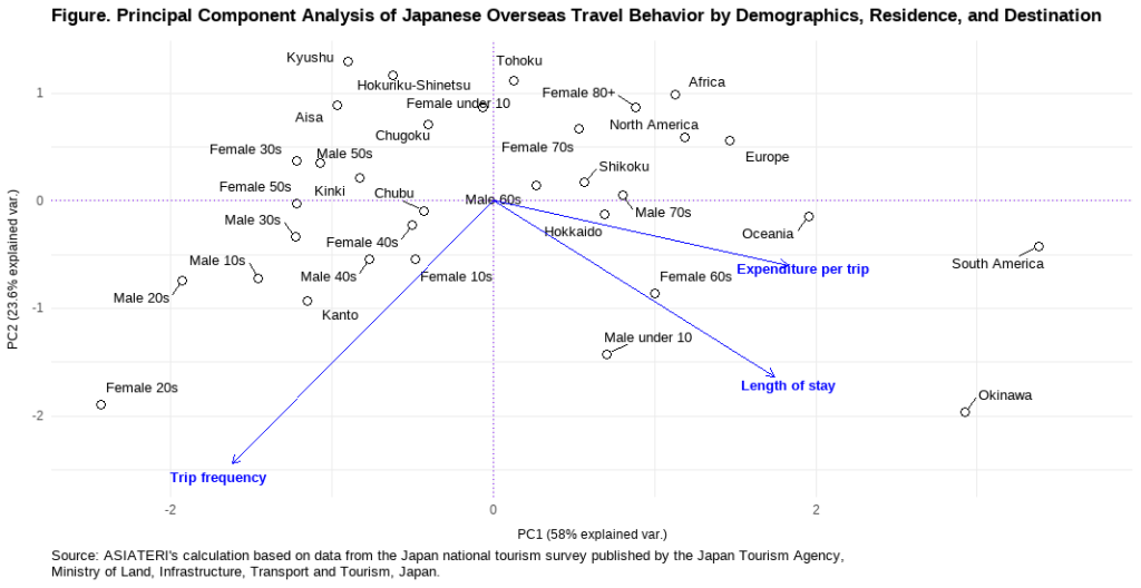 The principal component analysis based on Japanese outbound travel data for the third quarter of 2025 (July~September) reveals a clear two-dimensional structure explaining 81.6% of the total variance (PC1 = 58.0%, PC2 = 23.6%), indicating that heterogeneous travel behavior across demographic groups, residential regions, and destination markets during this period can be summarized by a fundamental economic trade-off between travel frequency and per-trip value. The accompanying PCA biplot visually reinforces this structure by simultaneously displaying observation clusters and variable loading vectors, thereby illustrating how frequency, expenditure, and length of stay jointly organize the outbound tourism system within a reduced-dimensional economic space. The first principal component loads positively on expenditure per trip and length of stay while loading negatively on trip frequency, representing a continuum from frequent, low-cost, short-duration travel to infrequent, high-value, long-stay travel. The second component further differentiates life-cycle travel behavior by contrasting youth-driven short-cycle mobility with mature long-duration consumption patterns. Together, these dimensions demonstrate that Japanese outbound tourism in the third quarter of 2025 is primarily structured by the tension between mobility intensity and economic value per journey.