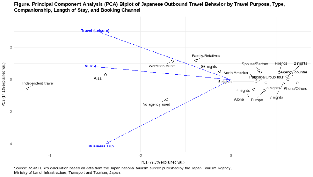 The principal component analysis (PCA) based on quarterly Japanese outbound travel micro-aggregation for July~September 2025 reveals a strongly structured two-dimensional behavioral space that captures the dominant heterogeneity in travel purpose, companionship, duration, and booking modality. The first principal component (PC1) explains 79.3% of the total variance, while the second component (PC2) accounts for an additional 14.1%, jointly summarizing more than nine-tenths of observed variation and therefore providing a robust low-dimensional representation of outbound travel behavior. As visualized in the accompanying PCA biplot, PC1 primarily differentiates independent, digitally mediated, and regionally proximate travel from agency-mediated, packaged, and longer-haul travel configurations. Negative PC1 scores, positioned on the left side of the biplot, are closely associated with independent travel, online booking, Asia-bound destinations, and visiting-friends-and-relatives (VFR) or leisure-oriented purposes, indicating flexible, lower-commitment mobility patterns. In contrast, positive PC1 scores cluster agency counter booking, package or group tours, North American and European destinations, and multi-night stays, reflecting higher transaction intensity, longer planning horizons, and greater expenditure commitment typical of organized long-distance tourism.